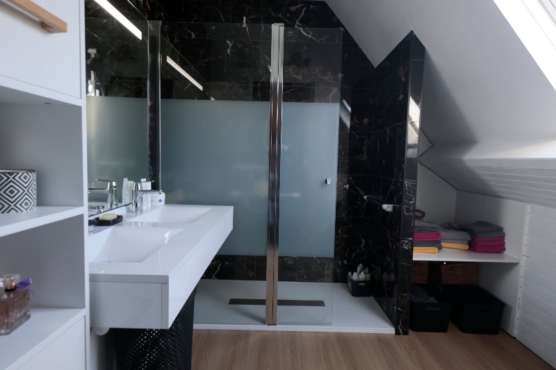 Nous avons enlevé la baignoire pour venir installer à la place un receveur de douche extra plat et antidérapant. L’espace douche est délimité par une paroi de douche avec bandeau d’intimité.