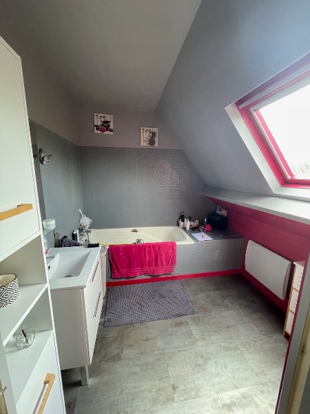 Monsieur et Madame L. vivent dans une maison à étage, la salle de bain du couple se trouve à l’étage. La pièce est composé d’une baignoire, d’un lavabo et d’un meuble sous la vasque.
